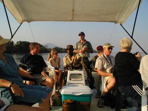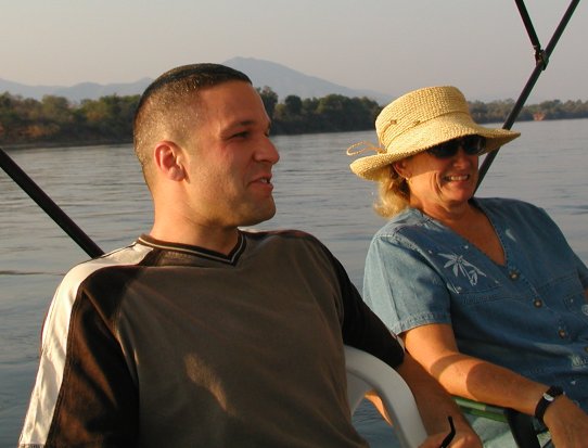 Shortly after arrival at Kasakasaka, we took a sunset boatride on the Zambezi, along with our fellow campers from Norway and...Chattanooga! The world is too small. Lawrence and Nici, the camp's Australian/South African managers, hold down the back of the boat.