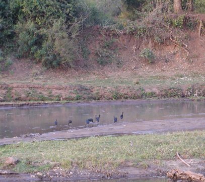 The least colorful of the park's spectacular bird life: glossy ibises. We saw plenty of birds - Egyptian geese, cattle egrets, martial eagles, giant eagle owls, grey louries, mousebirds, kingfishers, the amazing hoopoe, nightjars, white-helmeted shrikes, hornbills, francolins, guineafowl and all sorts of wading birds.