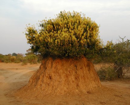 Termites control the interior humidity and temperature of their mounds, made from sand that has been hardened by the termites. Plant seeds often sprout and thrive alongside the wood munchers.